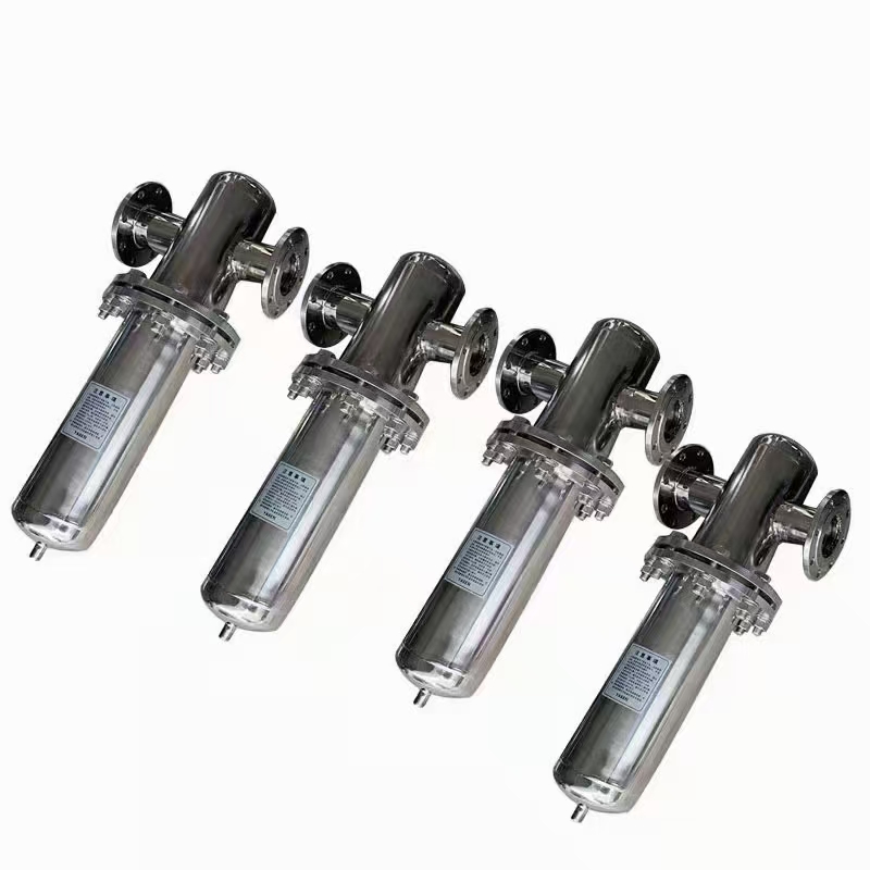 不銹鋼過濾器,由殼體、多元濾芯、反沖洗機構、和差壓控制器等部分組成后由不銹鋼過濾器殼體內的橫隔板將其內腔分為上、下兩腔,上腔內配有多個過濾芯,這樣充分利用了過濾空間,顯著縮小了過濾器的體積,下腔內安裝有反沖 洗吸盤。工作時,濁液經入口進入過濾器下腔,又經隔板孔進入濾芯的內腔。大于過濾芯縫隙的雜質被截留,凈液穿過縫隙到達上腔, *后從出口送出。